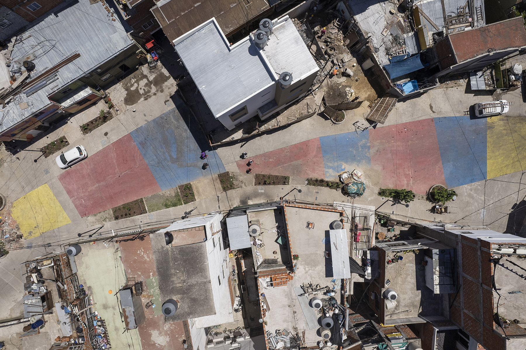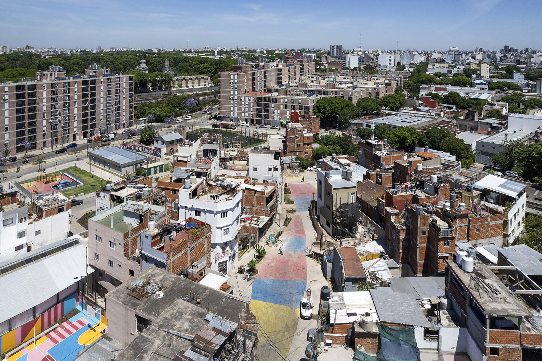 El diseño propuso una infraestructura significativa y compartida, que dio nuevamente paso a un sentido colectivo de pertenencia. Este espacio recuperó su condición de activo para el uso y disfrute de todos: un lugar donde los niños pueden jugar de forma segura, las madres y padres pueden cuidar a sus hijos y la comunidad puede encontrarse y hacer deporte. Además de los campos de juego, que permiten alternar entre vóley y básquet, se incorporaron superficies absorbentes con vegetación arbustiva y mobiliario urbano para apoyar las actividades. Como elemento distintivo, un vibrante mural en el piso y los muros, realizado por el reconocido artista RON, aporta color y carácter al lugar, convirtiéndolo en un verdadero punto de encuentro para la comunidad.